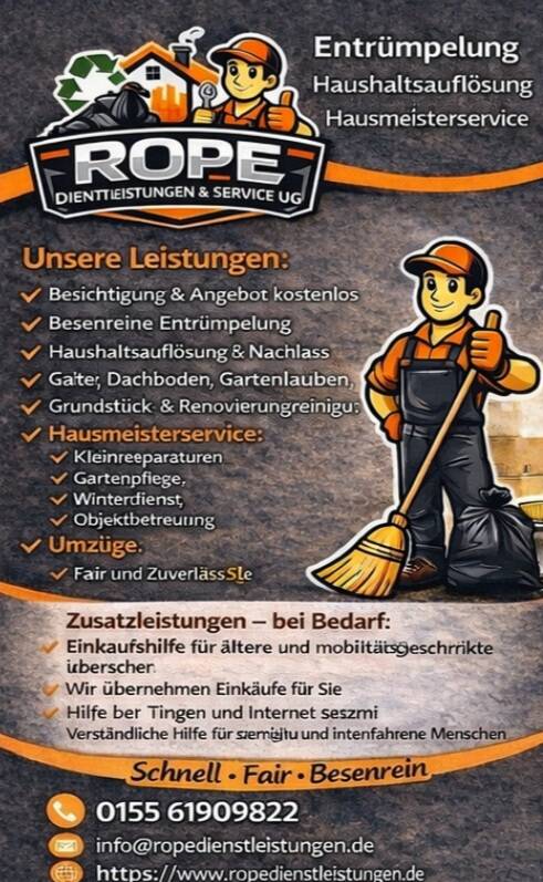 Rope Dienstleistungen ist Ihr zuverlässiger Partner für Entrümpelungen, Haushaltsauflösungen,Umzüge, Hausmeisterservice und Gebäudereinigungen in Altenburg und Umgebung bis 100km. Wir arbeiten sauber, termingerecht und transparent – für Privatkunden, Vermieter und Unternehmen. Unser Ziel ist es, zufriedene Kunden, kontinuierliche Anfragen und der Aufbau eines zuverlässigen Teams. Dabei stehen Qualität, Fairness und ein professioneller Auftritt immer im Mittelpunkt.